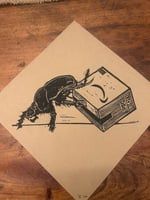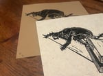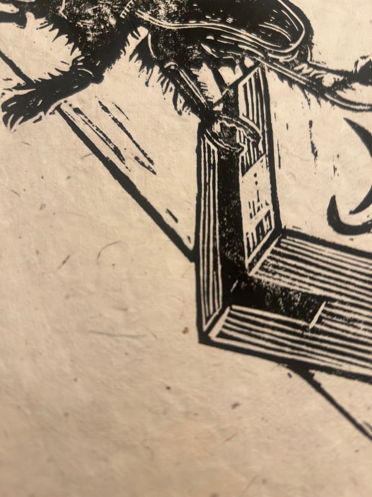 8”x8” block print on either brown toned “cardboard” color or a heavily textured Lotka paper. Lotka paper is naturally going to have some areas of lost ink transfer due to the texture of the paper.